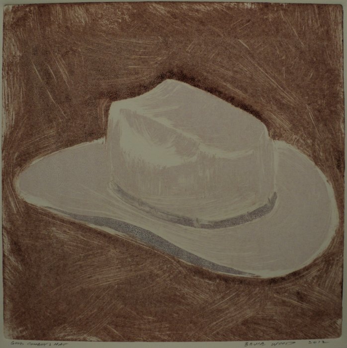 Bruce Wood is a master print maker specializing in silk screen printing. At his AFAPress studio in Michigan he produced fine prints and graphics for nationally known artists. A selection of these prints can be seen at the AFA Press website. He also produces monotypes (one-of-a-kind prints). The Hat Project: Monotypes, 12x12 inch images, $200 each, unframed