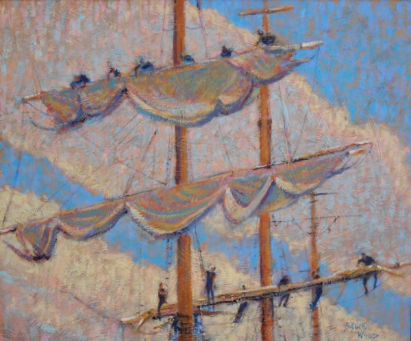 Crew of The Eagle furling the sails on arrival at New London, CT.