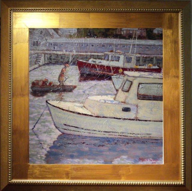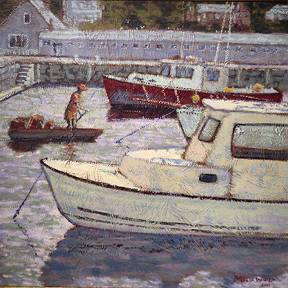 The lobsterman's day starts early, but his commute is the envy of many on the shore. The textured rhythms throughout this idyllic view enhance the colors and gently rolling surface of the harbor. The effect helps you remember the pleasure of being there.