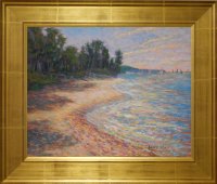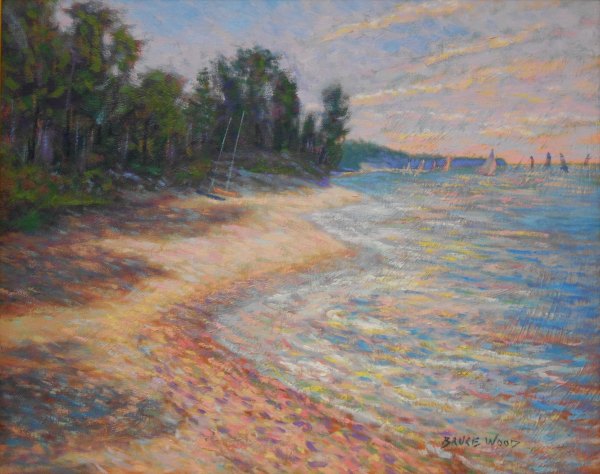 The sands of this beach are in constant motion, pushed by tides and wind. Sometimes it's wide, and a few days later it can be narrow. One year the water covered it all the way to the tree line. This painting is how I remember it on the day I first saw it.